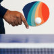Abstract illustration of colourful (red, orange, blue, turquoise, navy blue) sun rays with curvy geometric stripes decoration