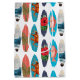 A colourful retro themed surfboard pattern design featuring different types surfboard art. Vintage illustrations of tropical fish, beach, hibiscus flowers and palm trees create an eclectic mix of colourful surfboards. Ideal surfboard design for anyone who loves surfing, the beach, colourful beach themed gifts and décor.