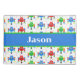 Fun child's personalised pillowcase done in a green, blue, yellow and red cartoon robot pattern. Personalise the name to suit your needs.