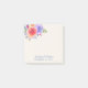 Personalised wedding post-it notes with a fanciful floral bouquet with watercolor roses. Stylish, whimsical and creative. A bundle of roses in pink, purple and yellow. With lots of sprigs and leaves in green, pink, purple and blue. Background is an off-white champagne colour.