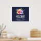 Welceom to our wedding personalised poster with a fanciful floral bouquet with watercolor roses. Stylish, whimsical and creative. A bundle of roses in pink, purple and yellow. With lots of sprigs and leaves in green, pink, purple and blue. Navy blue background.