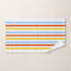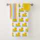 Fun colourful children's bathroom towel set, with the bath towel done in a pattern of yellow rubber duckies. The hand towel is done in yellow blue and orange stripes and the wash cloth is a solid yellow. Customise to add any text you want.