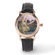 The original cute donkey portrait on this unique wrist watch with numbers is an original pencil drawing of a little donkey I photographed at a festival. This sepia realist art donkey picture is set against an original stylised landscape sunset painting. The original landscape image is a watercolor painting of a few winter trees against a pink sunset sky. This is a customisable watch, you can personalise it with your own text.