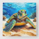 Vivid artistic depiction of a sea turtle with bright colours swimming among corals in a clear underwater ocean scene.