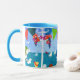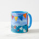A white ringer mug with a powder blue rim and handle and a handpainted paper collage of a bright and colourful seaside scene. See also matching greeting card, poster, gifts and apparel.