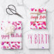 One design features colourful streamers with template "Happy Birthday" text. Two designs feature pink and purple sequins with template text. Personalise the template birthday text, keep that text or edit using the design tool to select a font style, size and colour you prefer.