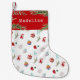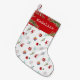 Add a festive touch to your holiday decor with this custom Christmas stocking! Featuring a playful pattern of Santa, ornaments, deer, and sprigs of greenery on a white background, and a vibrant red cuff personalised with a name. Perfect for a merry and bright holiday!