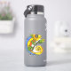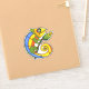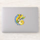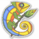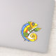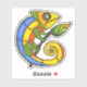 This vinyl sticker is a colourful smiling lizard in blue, yellow, green, and orange holding a green leaf on a twig.