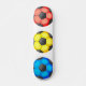 Illustration of a blue, yellow and red soccer ball standing in a row.