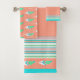 Southwestern inspired bath towel set done in coral with tribal patterns and feather accents in turquoise, white, green and pink. Matching Southwestern bath decor is available.