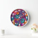A clock with a cool digital 3d style pattern. Bright and colourful flowers with a cool style which looks like paper cutouts.