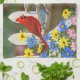 A spring gathering of colourful birds and flowers around a pretty water fountain birdbath.