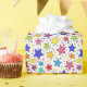 This fun wrapping paper features assorted size star shapes in multi-colours on a white background.
