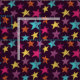Bright and bold painted style illustrations of stars in lilac purple, bright turquoise blue, yellow, magenta pink and orange are set against a dark purple background on this patterned fabric.