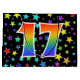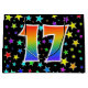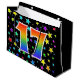This exciting, fun, and vibrant gift bag design features many colourful star shapes, along with the number "17" featuring a multicolored rainbow inspired spectrum gradient pattern, on a black coloured background. A gift bag like this could perhaps be a fun and happy way of wrapping gifts or presents being given for somebody’s seventeenth birthday, or perhaps for a couple’s seventeenth wedding anniversary, or some other 17th event. [~Z0000347]