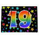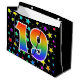 This exciting, fun, and vibrant gift bag design features many colourful star shapes, along with the number "19" featuring a multicolored rainbow inspired spectrum gradient pattern, on a black coloured background. A gift bag like this might be a fun way to wrap presents or gifts being given for somebody’s nineteenth birthday, or perhaps for a couple’s nineteenth wedding anniversary, or some other 19th event. [~Z0000347]