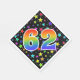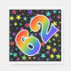 This exciting, fun, and vibrant paper napkin design features a colourful pattern of star shapes, along with the number "62" featuring a multicolored rainbow spectrum like gradient pattern, on a black coloured background. Paper napkins like this might be fun to use at a party when celebrating somebody’s sixty second birthday, or perhaps a couple’s sixty second wedding anniversary, or some other 62nd event. [~Z0000346]