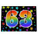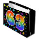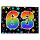 This exciting, fun, and vibrant gift bag design features a colourful star field pattern, along with the number "63" having a multicolored rainbow spectrum like gradient pattern, on a black coloured background. A gift bag like this might be a fun, happy way of wrapping gifts or presents being given for somebody’s sixty third birthday, or perhaps for a couple’s sixty third wedding anniversary, or some other 63rd event. [~Z0000347]