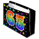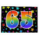 This exciting, fun, and vibrant gift bag design features a pattern of colourful star shapes, along with the number "65" having a multicolored rainbow inspired spectrum gradient pattern, on a black coloured background. A gift bag like this might be a fun, happy way of wrapping gifts or presents being given for somebody’s sixty fifth birthday, or perhaps for a couple’s sixty fifth wedding anniversary, or some other 65th event. [~Z0000347]