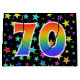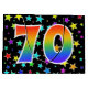 This exciting, fun, and vibrant gift bag design features many colourful star shapes, along with the number "70" featuring a multicolored rainbow inspired spectrum gradient pattern, on a black coloured background. A gift bag like this might be a fun way to wrap presents or gifts being given for somebody’s seventieth birthday, or perhaps for a couple’s seventieth wedding anniversary, or some other 70th event. [~Z0000347]