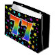 This exciting, fun, and vibrant gift bag design features a colourful star shapes pattern, along with the number "77" featuring a multicolored rainbow spectrum like gradient pattern, on a black coloured background. A gift bag like this could perhaps be a fun way to wrap presents or gifts being given for somebody’s seventy seventh birthday, or perhaps for a couple’s seventy seventh wedding anniversary, or some other 77th event. [~Z0000347]