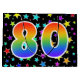 This exciting, fun, and vibrant gift bag design features numerous colourful star shapes, along with the number "80" featuring a multicolored rainbow inspired spectrum gradient pattern, on a black coloured background. A gift bag like this could perhaps be a fun and happy way of wrapping gifts or presents being given for somebody’s eightieth birthday, or perhaps for a couple’s eightieth wedding anniversary, or some other 80th event. [~Z0000347]