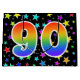 This exciting, fun, and vibrant gift bag design features a colourful pattern of star shapes, along with the number "90" featuring a multicolored rainbow spectrum like gradient pattern, on a black coloured background. A gift bag like this might be a fun way to wrap presents or gifts being given for somebody’s ninetieth birthday, or perhaps for a couple’s ninetieth wedding anniversary, or some other 90th event. [~Z0000347]
