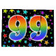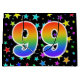 This exciting, fun, and vibrant gift bag design features a colourful star field pattern, along with the number "99" having a multicolored rainbow spectrum like gradient pattern, on a black coloured background. A gift bag like this could perhaps be a fun way to wrap presents or gifts being given for somebody’s ninety ninth birthday, or perhaps for a couple’s ninety ninth wedding anniversary, or some other 99th event. [~Z0000347]