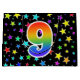 This exciting, fun, and vibrant gift bag design features a colourful stars pattern, along with the number "9" having a multicolored rainbow inspired spectrum gradient pattern, on a black coloured background. A gift bag like this might be a fun, happy way of wrapping gifts or presents being given for somebody’s ninth birthday, or perhaps for a couple’s ninth wedding anniversary, or some other 9th event. [~Z0000347]
