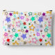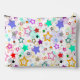 multi-coloured design blends solid and outlined star shapes in a playful, chaotic harmony of red, purple, blue, gold, and teal on a White background