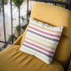This throw pillow features colourful horizontal stripes in fall colours: white, yellow, orange, red, and dark grey.