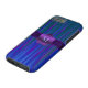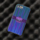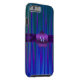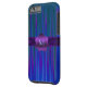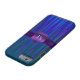 Stylish iPhone 6 case, with a foil looking blue, teal, purple and mauve abstract striped pattern. Graphics of a purple satin looking ribbon, runs across the middle of the case, is decorated with a purple wax looking seal, with a light blue one letter monogram. Personalise the letter for yourself or as a great gift idea.