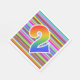 This fun, exciting, and eye-catching paper napkin design features a multicolored stripes pattern, along with the number "2" having a multicolored rainbow inspired gradient pattern. Paper napkins like these could be fun to use at a party being held to celebrate somebody’s second birthday, or perhaps a couple’s second wedding anniversary, or some other 2nd event. [~Z0000352]