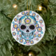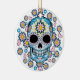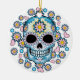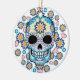 Sugar skull designed hues of blue and pink is surrounded by colourful flowers and hearts.