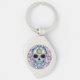 Sugar skull designed hues of blue and pink is surrounded by colourful flowers and hearts.