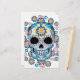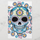 Sugar skull designed hues of blue and pink is surrounded by colourful flowers and hearts.