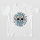 Sugar skull designed hues of blue and pink is surrounded by colourful flowers and hearts.