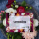 An elegant & fancy wedding Escort card design with a mix of beautiful summer flowers on a magenta background and customisable black typography on a transparent white and gold frame background.