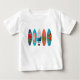 A colourful surfboard design featuring different types surfboard art. Vintage illustrations of tropical fish, beach, hibiscus flowers and palm trees create an eclectic mix of colourful surfboards. Ideal surfboard design for anyone who loves surfing, the beach, colourful beach themed gifts and décor.