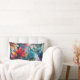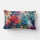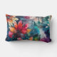 Lumbar pillow with a colourful teal, blue, purple, and orange watercolor flower painting.