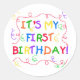 It's My First Birthday design with multicolor primary colours kid style text on first birthday T-shirts, creepers, cards, stickers, bags, and more.