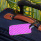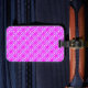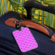 Colourful luggage tag with a tie-dye pattern behind the colour.