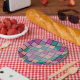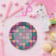 Graphical tiles in joyful colours, separated by black lines. It's general, but colourful, and can suit any occasion. The main area is covered with a semi transparent layer to make the part with food tidier, but you can remove this layer if you prefer full colour effect all over the plate. The semi transparent layer is good if you want to add text - it will make the text or logo stand out more.