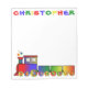 Fun, bright, multicolored choo choo train features red, blue, yellow, green, purple and orange gradients with smoke circles and striped wheels on white background. Personalise with name. Use one letter per template and delete any extras. To centre text after name is entered: Click CUSTOMIZE IT, HOLD CTRL down while clicking each letter of name (to highlight them), Click ARRANGE, Click CENTER HORIZONTALLY.