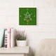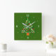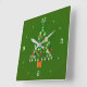 A green Christmas clock with a colourful tree with baubles in the centre. This traditional design also has white numerals.Available in square and round shapes.