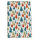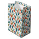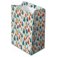 Red, gold, green, and blue stylised trees on a snowy background makes a festive and cheerful gift bag for the holidays.