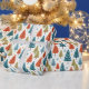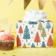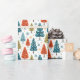 Red, gold, green, and blue stylised trees on a snowy background makes a festive and cheerful wrapping paper for the holidays.