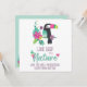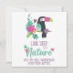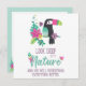 This inspirational card features a lovely tropical print in vivid colours, with a cute cartoon toucan, colourful tropical leaves and flowers, and a little pink bird.