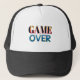Trucker hat with "Game Over" text in colorful, bold letters on a white front panel and black mesh back. A person models the hat, exuding a casual style.