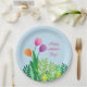 This Mother's Day paper plate features a spring design with orange, pink and purple tulips and green vegetation. Customisable text reads: Happy Mother's Day!